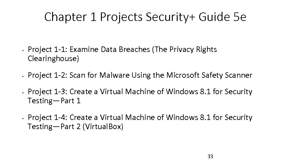Chapter 1 Projects Security+ Guide 5 e • • Project 1 -1: Examine Data Breaches (The Privacy Rights Clearinghouse) Project 1 -2: Scan for Malware Using the Microsoft Safety Scanner Project 1 -3: Create a Virtual Machine of Windows 8. 1 for Security Testing—Part 1 Project 1 -4: Create a Virtual Machine of Windows 8. 1 for Security Testing—Part 2 (Virtual. Box) 33