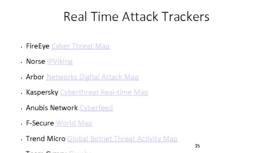 Real Time Attack Trackers • Fire. Eye Cyber Threat Map • Norse IPViking • Arbor Networks Digital Attack Map • Kaspersky Cyberthreat Real-time Map • Anubis Network Cyberfeed • F-Secure World Map • Trend Micro Global Botnet Threat Activity Map 35