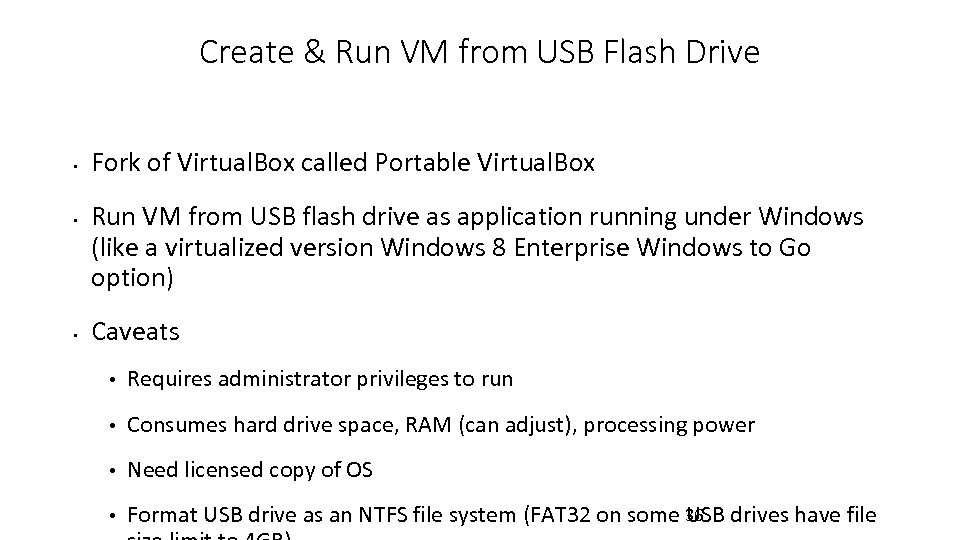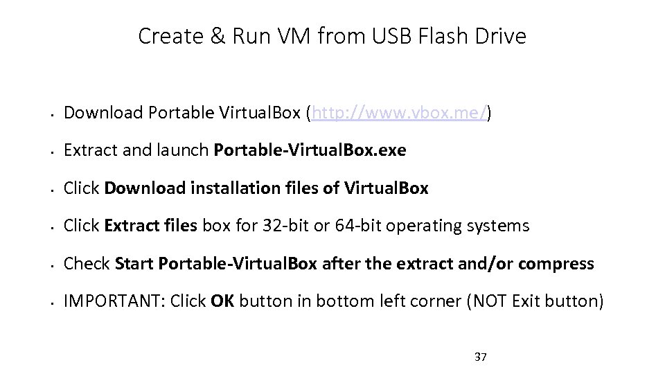Create & Run VM from USB Flash Drive • • • Fork of Virtual. Box called Portable Virtual. Box Run VM from USB flash drive as application running under Windows (like a virtualized version Windows 8 Enterprise Windows to Go option) Caveats • Requires administrator privileges to run • Consumes hard drive space, RAM (can adjust), processing power • Need licensed copy of OS • 36 Format USB drive as an NTFS file system (FAT 32 on some USB drives have file
