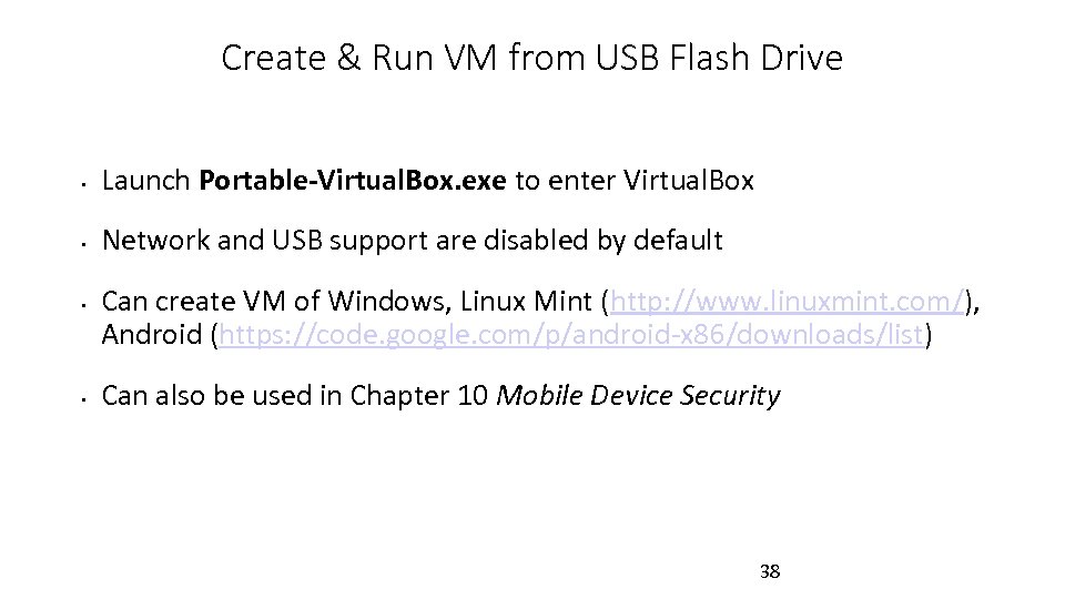 Create & Run VM from USB Flash Drive • Launch Portable-Virtual. Box. exe to enter Virtual. Box • Network and USB support are disabled by default • • Can create VM of Windows, Linux Mint (http: //www. linuxmint. com/), Android (https: //code. google. com/p/android-x 86/downloads/list) Can also be used in Chapter 10 Mobile Device Security 38