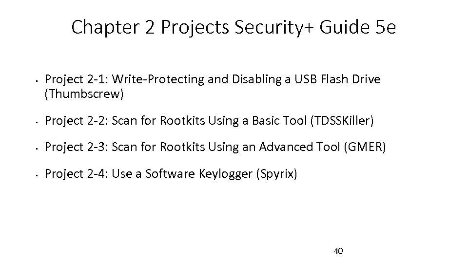 Chapter 2 Projects Security+ Guide 5 e • Project 2 -1: Write-Protecting and Disabling a USB Flash Drive (Thumbscrew) • Project 2 -2: Scan for Rootkits Using a Basic Tool (TDSSKiller) • Project 2 -3: Scan for Rootkits Using an Advanced Tool (GMER) • Project 2 -4: Use a Software Keylogger (Spyrix) 40