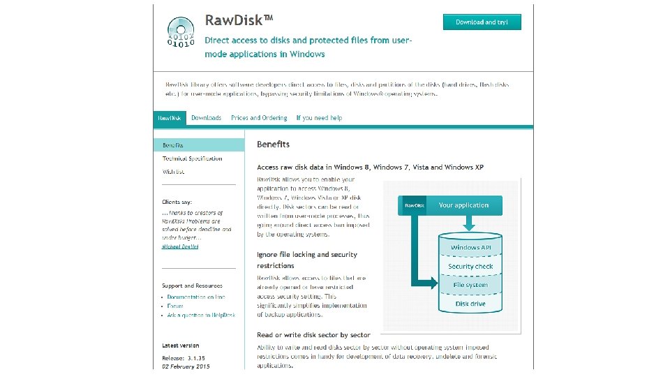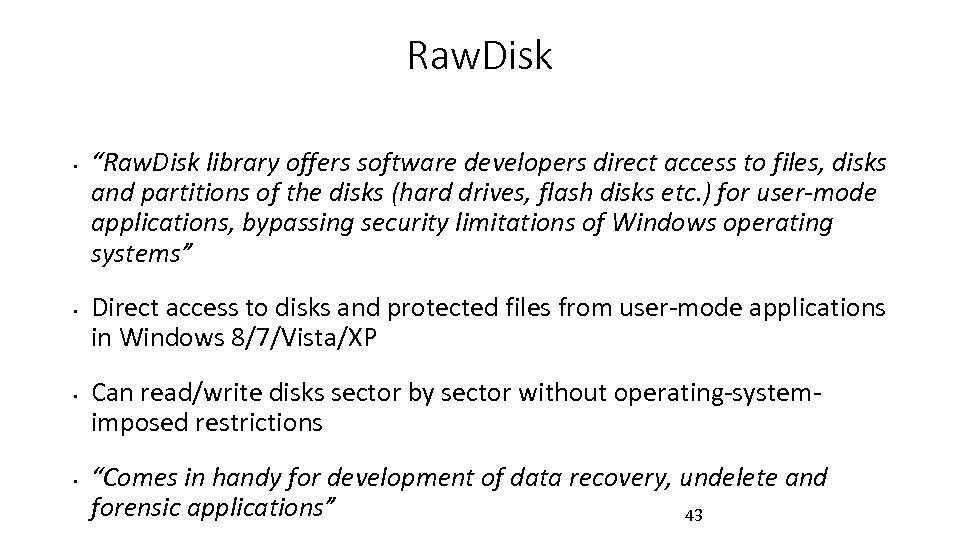 Raw. Disk • • “Raw. Disk library offers software developers direct access to files, disks and partitions of the disks (hard drives, flash disks etc. ) for user-mode applications, bypassing security limitations of Windows operating systems” Direct access to disks and protected files from user-mode applications in Windows 8/7/Vista/XP Can read/write disks sector by sector without operating-systemimposed restrictions “Comes in handy for development of data recovery, undelete and forensic applications” 43