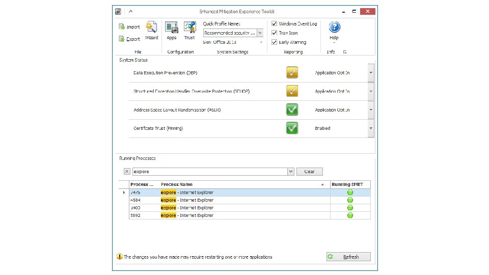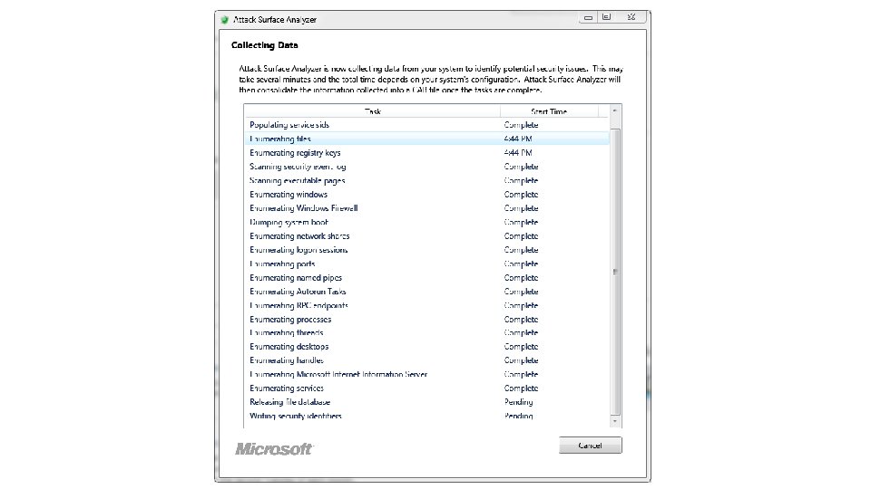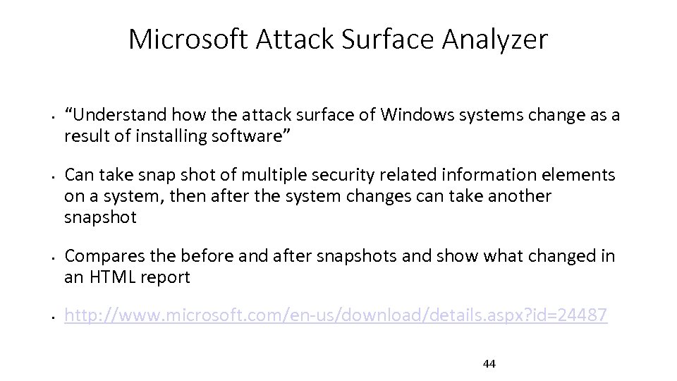 Microsoft Attack Surface Analyzer • • “Understand how the attack surface of Windows systems change as a result of installing software” Can take snap shot of multiple security related information elements on a system, then after the system changes can take another snapshot Compares the before and after snapshots and show what changed in an HTML report http: //www. microsoft. com/en-us/download/details. aspx? id=24487 44