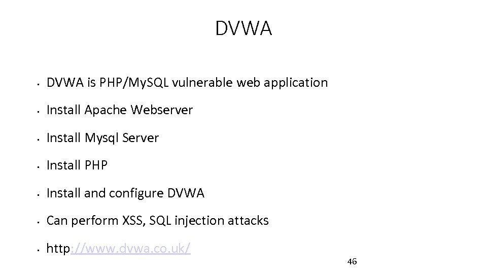 DVWA • DVWA is PHP/My. SQL vulnerable web application • Install Apache Webserver • Install Mysql Server • Install PHP • Install and configure DVWA • Can perform XSS, SQL injection attacks • http: //www. dvwa. co. uk/ 46