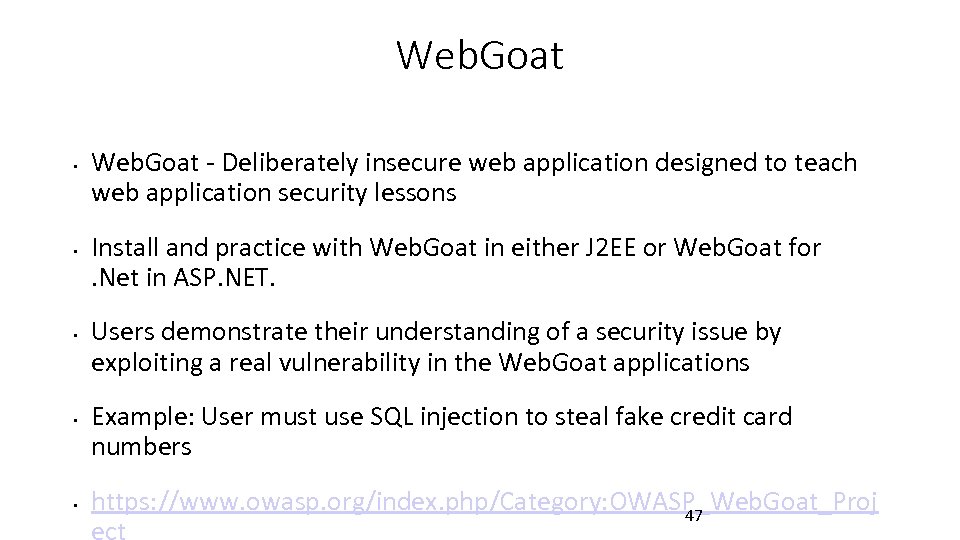 Web. Goat • • • Web. Goat - Deliberately insecure web application designed to teach web application security lessons Install and practice with Web. Goat in either J 2 EE or Web. Goat for . Net in ASP. NET. Users demonstrate their understanding of a security issue by exploiting a real vulnerability in the Web. Goat applications Example: User must use SQL injection to steal fake credit card numbers https: //www. owasp. org/index. php/Category: OWASP_Web. Goat_Proj 47