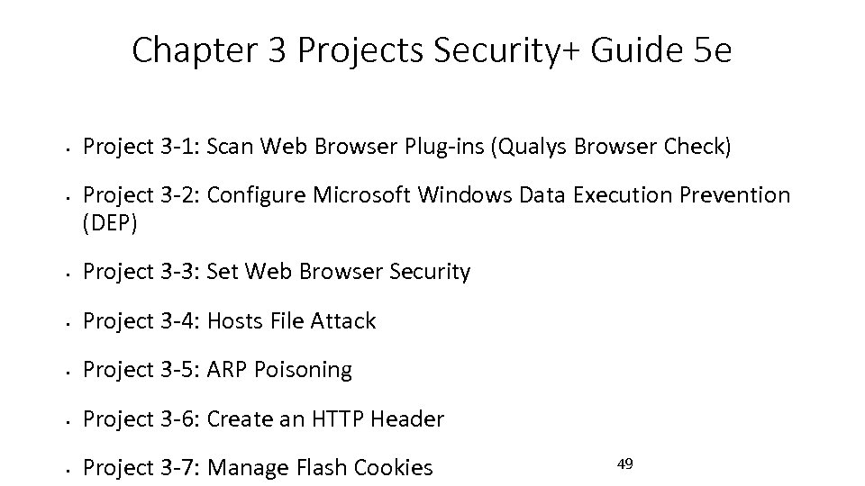 Chapter 3 Projects Security+ Guide 5 e • • Project 3 -1: Scan Web Browser Plug-ins (Qualys Browser Check) Project 3 -2: Configure Microsoft Windows Data Execution Prevention (DEP) • Project 3 -3: Set Web Browser Security • Project 3 -4: Hosts File Attack • Project 3 -5: ARP Poisoning • Project 3 -6: Create an HTTP Header • Project 3 -7: Manage Flash Cookies 49