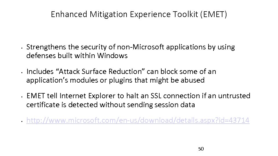 Enhanced Mitigation Experience Toolkit (EMET) • • Strengthens the security of non-Microsoft applications by using defenses built within Windows Includes “Attack Surface Reduction” can block some of an application’s modules or plugins that might be abused EMET tell Internet Explorer to halt an SSL connection if an untrusted certificate is detected without sending session data http: //www. microsoft. com/en-us/download/details. aspx? id=43714 50