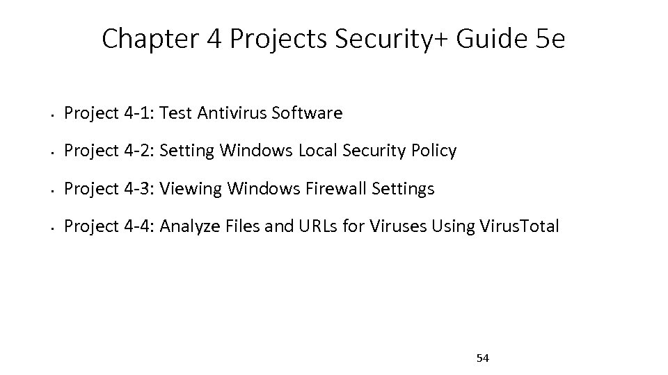 Chapter 4 Projects Security+ Guide 5 e • Project 4 -1: Test Antivirus Software • Project 4 -2: Setting Windows Local Security Policy • Project 4 -3: Viewing Windows Firewall Settings • Project 4 -4: Analyze Files and URLs for Viruses Using Virus. Total 54