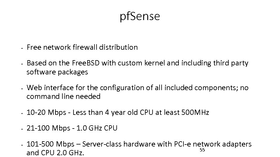 pf. Sense • • • Free network firewall distribution Based on the Free. BSD with custom kernel and including third party software packages Web interface for the configuration of all included components; no command line needed • 10 -20 Mbps - Less than 4 year old CPU at least 500 MHz • 21 -100 Mbps - 1. 0 GHz CPU • 101 -500 Mbps – Server-class hardware with PCI-e network adapters 55 and CPU 2. 0 GHz.