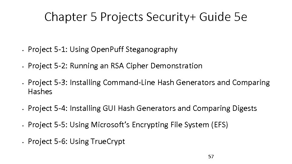 Chapter 5 Projects Security+ Guide 5 e • Project 5 -1: Using Open. Puff Steganography • Project 5 -2: Running an RSA Cipher Demonstration • Project 5 -3: Installing Command-Line Hash Generators and Comparing Hashes • Project 5 -4: Installing GUI Hash Generators and Comparing Digests • Project 5 -5: Using Microsoft’s Encrypting File System (EFS) • Project 5 -6: Using True. Crypt 57