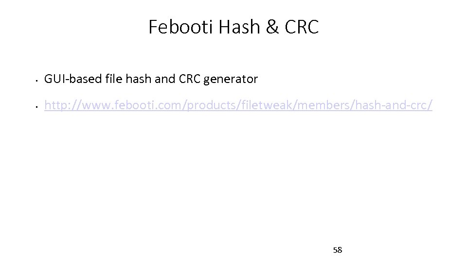 Febooti Hash & CRC • GUI-based file hash and CRC generator • http: //www. febooti. com/products/filetweak/members/hash-and-crc/ 58