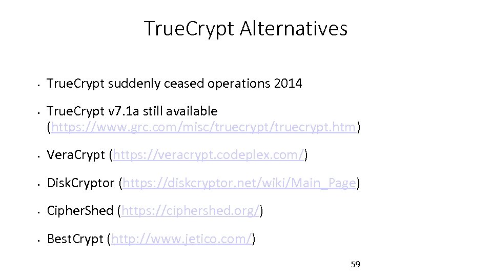 True. Crypt Alternatives • • True. Crypt suddenly ceased operations 2014 True. Crypt v 7. 1 a still available (https: //www. grc. com/misc/truecrypt. htm) • Vera. Crypt (https: //veracrypt. codeplex. com/) • Disk. Cryptor (https: //diskcryptor. net/wiki/Main_Page) • Cipher. Shed (https: //ciphershed. org/) • Best. Crypt (http: //www. jetico. com/) 59