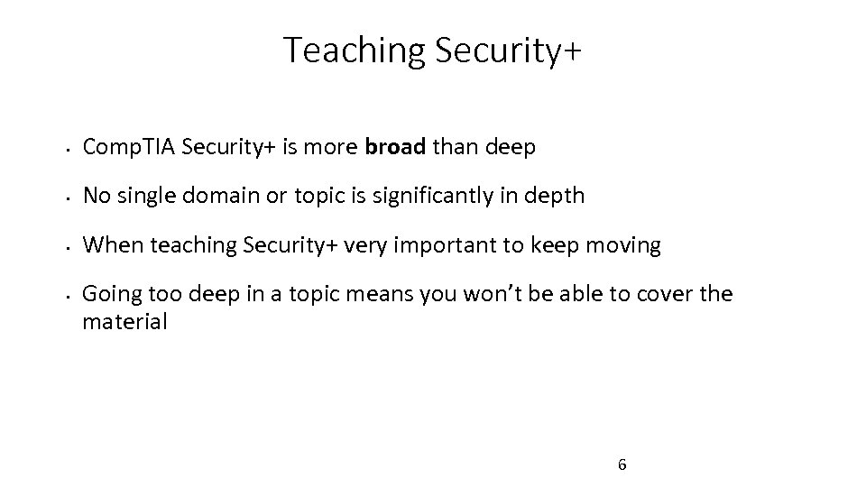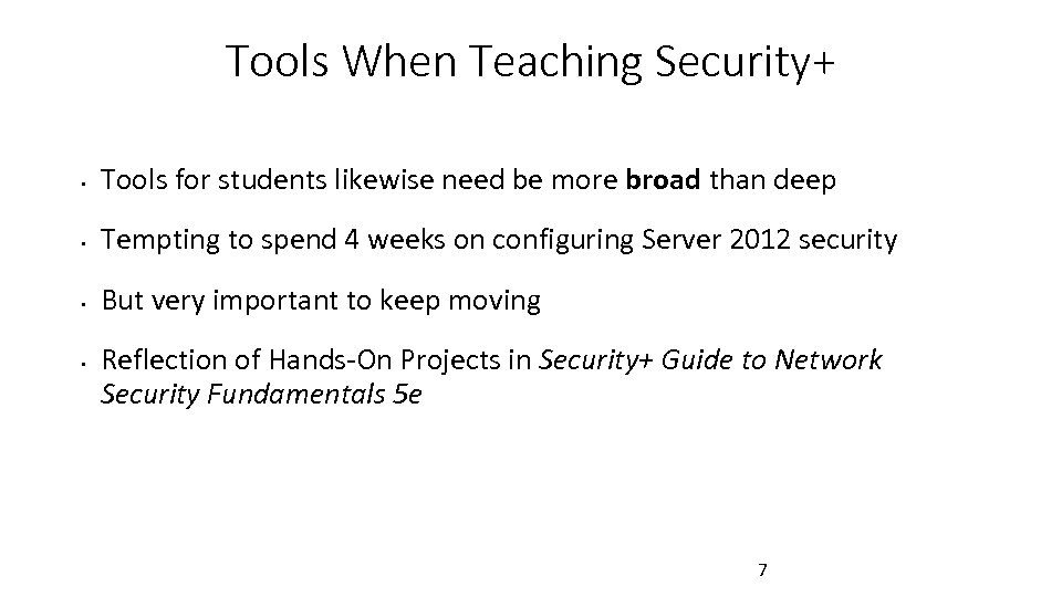 Teaching Security+ • Comp. TIA Security+ is more broad than deep • No single domain or topic is significantly in depth • When teaching Security+ very important to keep moving • Going too deep in a topic means you won’t be able to cover the material 6