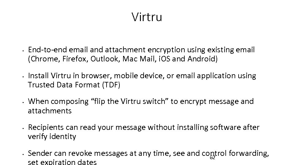 Virtru • • • End-to-end email and attachment encryption using existing email (Chrome, Firefox, Outlook, Mac Mail, i. OS and Android) Install Virtru in browser, mobile device, or email application using Trusted Data Format (TDF) When composing “flip the Virtru switch” to encrypt message and attachments Recipients can read your message without installing software after verify identity Sender can revoke messages at any time, see and control forwarding, 62