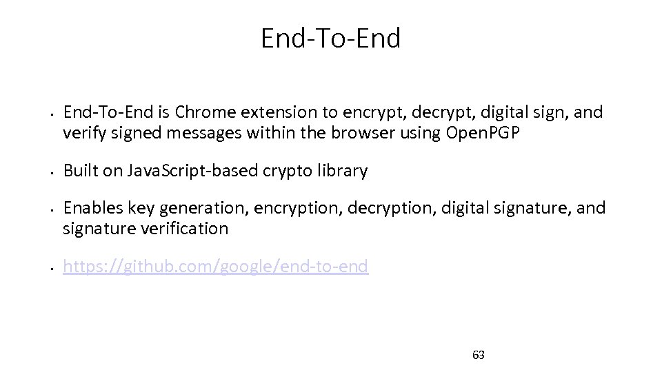 End-To-End • • End-To-End is Chrome extension to encrypt, decrypt, digital sign, and verify signed messages within the browser using Open. PGP Built on Java. Script-based crypto library Enables key generation, encryption, decryption, digital signature, and signature verification https: //github. com/google/end-to-end 63