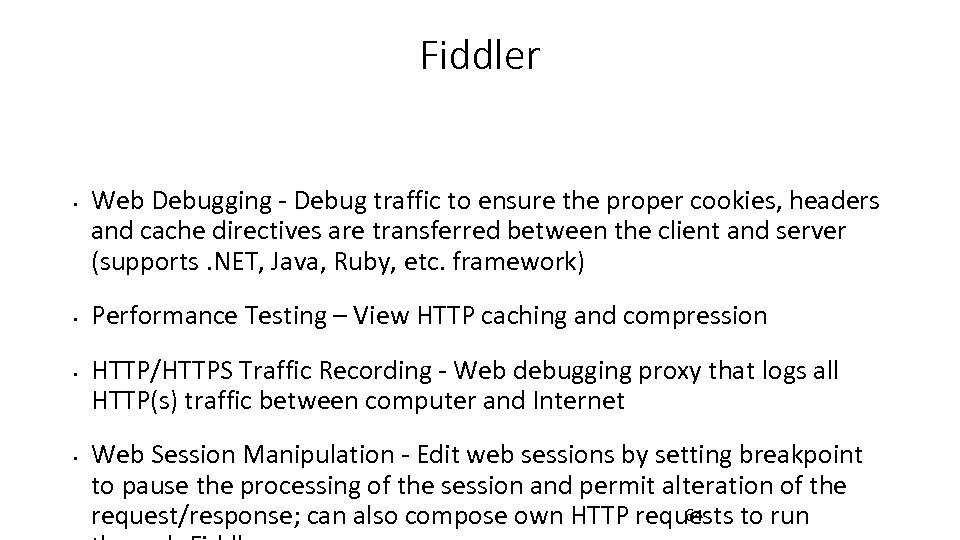 Fiddler • • Web Debugging - Debug traffic to ensure the proper cookies, headers and cache directives are transferred between the client and server (supports. NET, Java, Ruby, etc. framework) Performance Testing – View HTTP caching and compression HTTP/HTTPS Traffic Recording - Web debugging proxy that logs all HTTP(s) traffic between computer and Internet Web Session Manipulation - Edit web sessions by setting breakpoint to pause the processing of the session and permit alteration of the 64 request/response; can also compose own HTTP requests to run