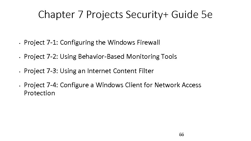 Chapter 7 Projects Security+ Guide 5 e • Project 7 -1: Configuring the Windows Firewall • Project 7 -2: Using Behavior-Based Monitoring Tools • Project 7 -3: Using an Internet Content Filter • Project 7 -4: Configure a Windows Client for Network Access Protection 66