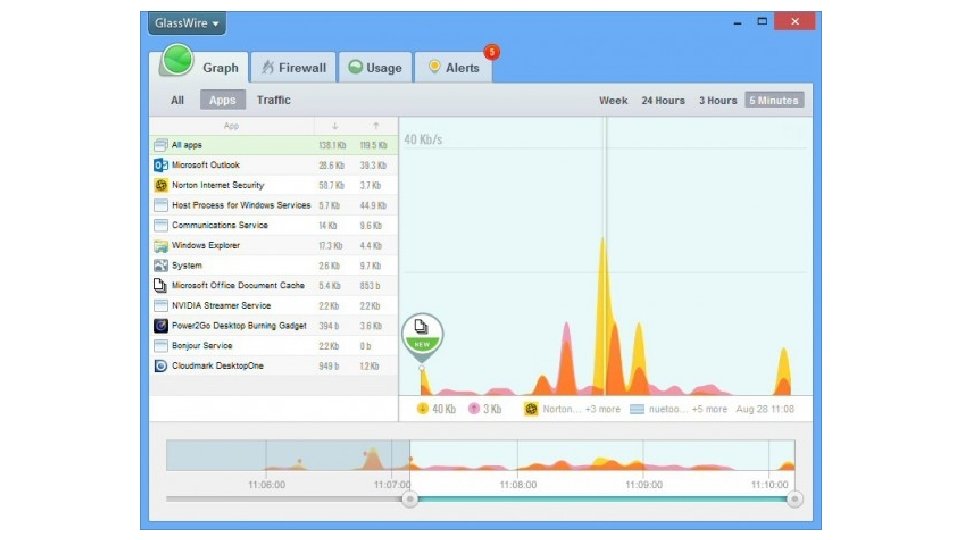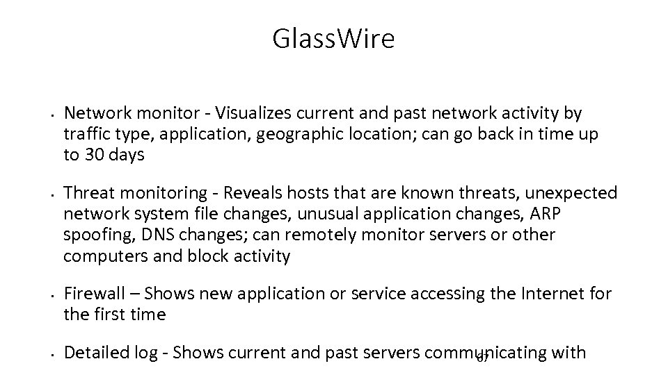 Glass. Wire • • Network monitor - Visualizes current and past network activity by traffic type, application, geographic location; can go back in time up to 30 days Threat monitoring - Reveals hosts that are known threats, unexpected network system file changes, unusual application changes, ARP spoofing, DNS changes; can remotely monitor servers or other computers and block activity Firewall – Shows new application or service accessing the Internet for the first time Detailed log - Shows current and past servers communicating with 67