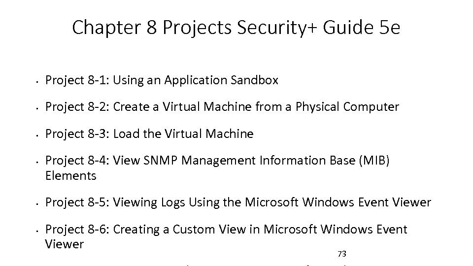 Chapter 8 Projects Security+ Guide 5 e • Project 8 -1: Using an Application Sandbox • Project 8 -2: Create a Virtual Machine from a Physical Computer • Project 8 -3: Load the Virtual Machine • • • Project 8 -4: View SNMP Management Information Base (MIB) Elements Project 8 -5: Viewing Logs Using the Microsoft Windows Event Viewer Project 8 -6: Creating a Custom View in Microsoft Windows Event Viewer 73