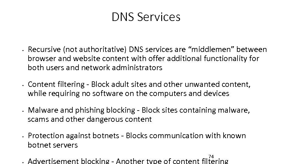 DNS Services • • Recursive (not authoritative) DNS services are “middlemen” between browser and website content with offer additional functionality for both users and network administrators Content filtering - Block adult sites and other unwanted content, while requiring no software on the computers and devices Malware and phishing blocking - Block sites containing malware, scams and other dangerous content Protection against botnets - Blocks communication with known botnet servers 74