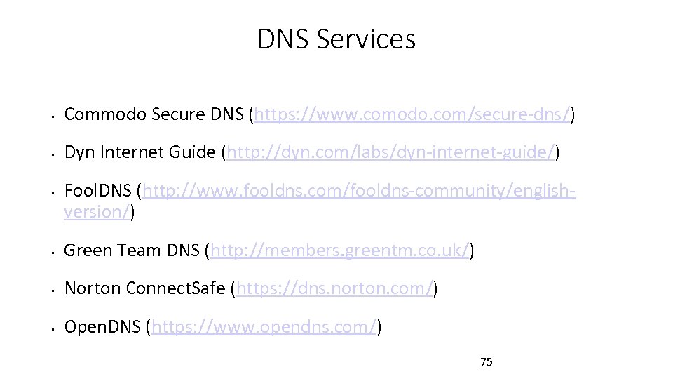 DNS Services • Commodo Secure DNS (https: //www. comodo. com/secure-dns/) • Dyn Internet Guide (http: //dyn. com/labs/dyn-internet-guide/) • Fool. DNS (http: //www. fooldns. com/fooldns-community/englishversion/) • Green Team DNS (http: //members. greentm. co. uk/) • Norton Connect. Safe (https: //dns. norton. com/) • Open. DNS (https: //www. opendns. com/) 75