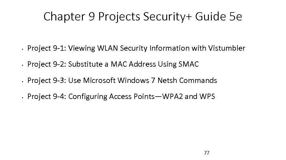Chapter 9 Projects Security+ Guide 5 e • Project 9 -1: Viewing WLAN Security Information with Vistumbler • Project 9 -2: Substitute a MAC Address Using SMAC • Project 9 -3: Use Microsoft Windows 7 Netsh Commands • Project 9 -4: Configuring Access Points—WPA 2 and WPS 77