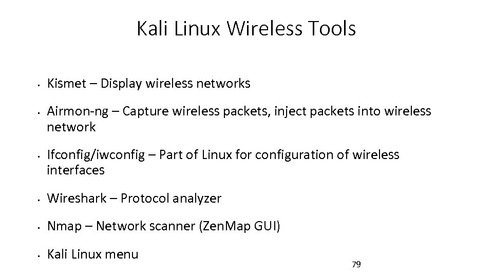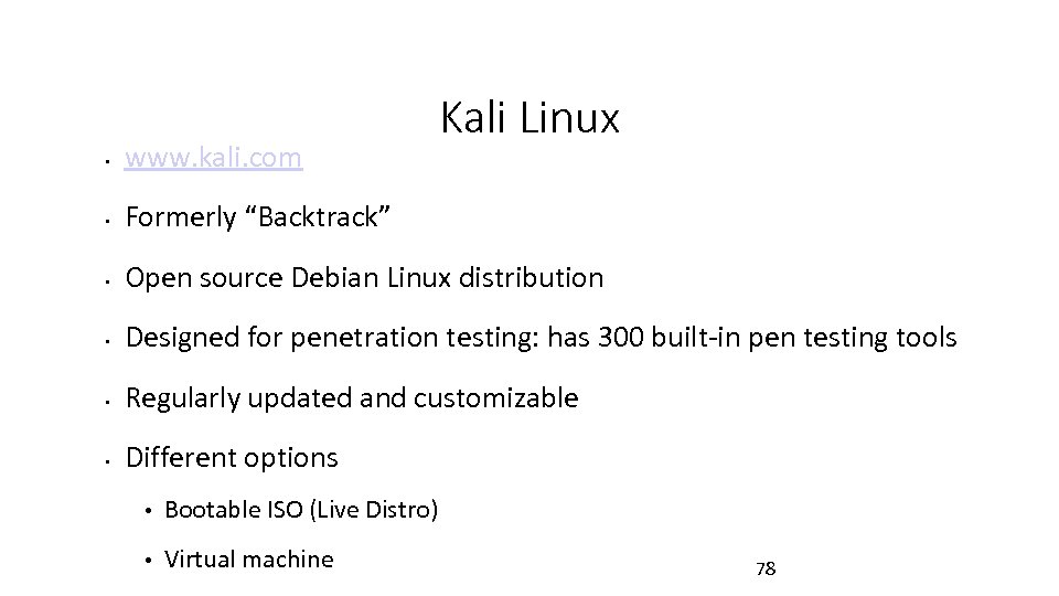 Kali Linux • www. kali. com • Formerly “Backtrack” • Open source Debian Linux distribution • Designed for penetration testing: has 300 built-in pen testing tools • Regularly updated and customizable • Different options • Bootable ISO (Live Distro) • Virtual machine 78