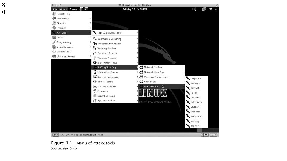 Kali Linux Wireless Tools • • • Kismet – Display wireless networks Airmon-ng – Capture wireless packets, inject packets into wireless network Ifconfig/iwconfig – Part of Linux for configuration of wireless interfaces • Wireshark – Protocol analyzer • Nmap – Network scanner (Zen. Map GUI) • Kali Linux menu 79