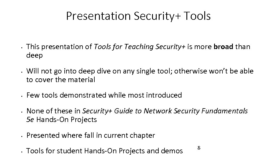 Tools When Teaching Security+ • Tools for students likewise need be more broad than deep • Tempting to spend 4 weeks on configuring Server 2012 security • But very important to keep moving • Reflection of Hands-On Projects in Security+ Guide to Network Security Fundamentals 5 e 7