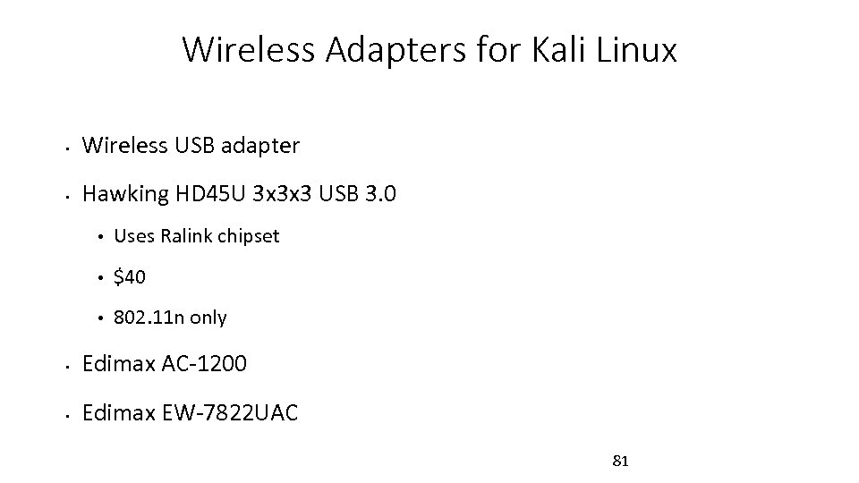 Wireless Adapters for Kali Linux • Wireless USB adapter • Hawking HD 45 U 3 x 3 x 3 USB 3. 0 • Uses Ralink chipset • $40 • 802. 11 n only • Edimax AC-1200 • Edimax EW-7822 UAC 81