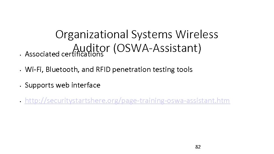 • Organizational Systems Wireless Auditor (OSWA-Assistant) Associated certifications • Wi-Fi, Bluetooth, and RFID penetration testing tools • Supports web interface • http: //securitystartshere. org/page-training-oswa-assistant. htm 82