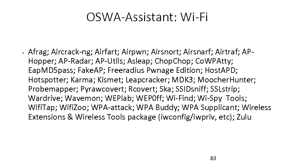 OSWA-Assistant: Wi-Fi • Afrag; Aircrack-ng; Airfart; Airpwn; Airsnort; Airsnarf; Airtraf; APHopper; AP-Radar; AP-Utils; Asleap; Chop; Co. WPAtty; Eap. MD 5 pass; Fake. AP; Freeradius Pwnage Edition; Host. APD; Hotspotter; Karma; Kismet; Leapcracker; MDK 3; Moocher. Hunter; Probemapper; Pyrawcovert; Rcovert; Ska; SSIDsniff; SSLstrip; Wardrive; Wavemon; WEPlab; WEP 0 ff; Wi-Find; Wi-Spy Tools; Wifi. Tap; Wifi. Zoo; WPA-attack; WPA Buddy; WPA Supplicant; Wireless Extensions & Wireless Tools package (iwconfig/iwpriv, etc); Zulu 83