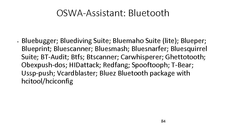 OSWA-Assistant: Bluetooth • Bluebugger; Bluediving Suite; Bluemaho Suite (lite); Blueper; Blueprint; Bluescanner; Bluesmash; Bluesnarfer; Bluesquirrel Suite; BT-Audit; Btfs; Btscanner; Carwhisperer; Ghettotooth; Obexpush-dos; HIDattack; Redfang; Spooftooph; T-Bear; Ussp-push; Vcardblaster; Bluez Bluetooth package with hcitool/hciconfig 84