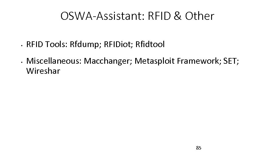 OSWA-Assistant: RFID & Other • • RFID Tools: Rfdump; RFIDiot; Rfidtool Miscellaneous: Macchanger; Metasploit Framework; SET; Wireshar 85