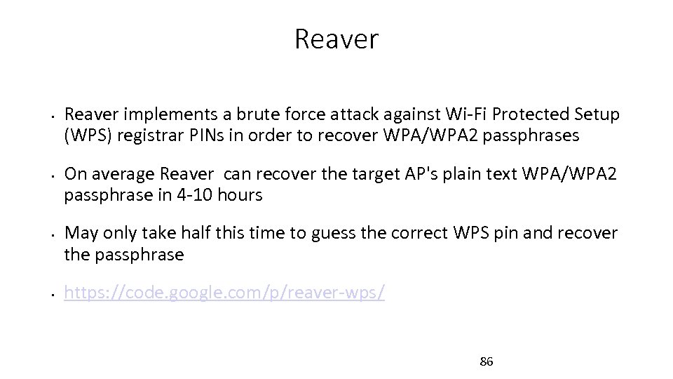 Reaver • • Reaver implements a brute force attack against Wi-Fi Protected Setup (WPS) registrar PINs in order to recover WPA/WPA 2 passphrases On average Reaver can recover the target AP's plain text WPA/WPA 2 passphrase in 4 -10 hours May only take half this time to guess the correct WPS pin and recover the passphrase https: //code. google. com/p/reaver-wps/ 86