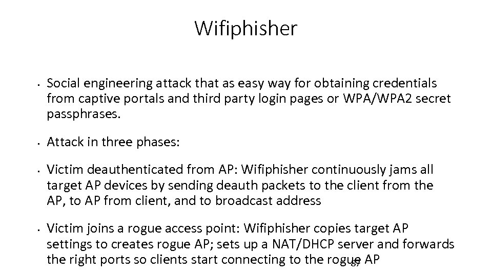Wifiphisher • • Social engineering attack that as easy way for obtaining credentials from captive portals and third party login pages or WPA/WPA 2 secret passphrases. Attack in three phases: Victim deauthenticated from AP: Wifiphisher continuously jams all target AP devices by sending deauth packets to the client from the AP, to AP from client, and to broadcast address Victim joins a rogue access point: Wifiphisher copies target AP settings to creates rogue AP; sets up a NAT/DHCP server and forwards the right ports so clients start connecting to the rogue AP 87