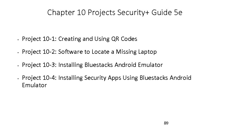 Chapter 10 Projects Security+ Guide 5 e • Project 10 -1: Creating and Using QR Codes • Project 10 -2: Software to Locate a Missing Laptop • Project 10 -3: Installing Bluestacks Android Emulator • Project 10 -4: Installing Security Apps Using Bluestacks Android Emulator 89