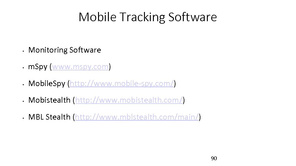 Mobile Tracking Software • Monitoring Software • m. Spy (www. mspy. com) • Mobile. Spy (http: //www. mobile-spy. com/) • Mobistealth (http: //www. mobistealth. com/) • MBL Stealth (http: //www. mblstealth. com/main/) 90