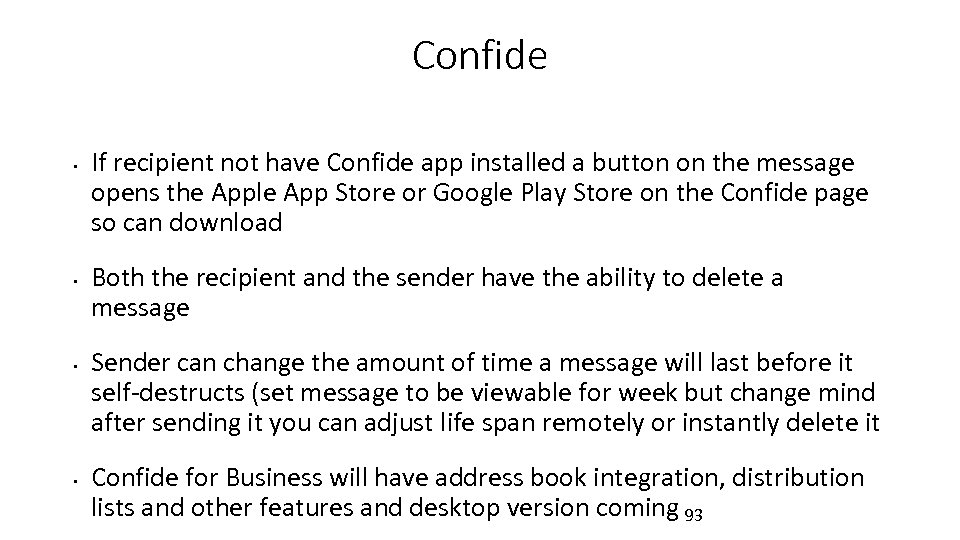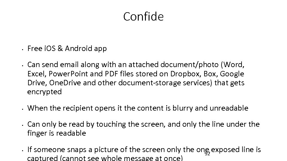 Confide • • • Free i. OS & Android app Can send email along with an attached document/photo (Word, Excel, Power. Point and PDF files stored on Dropbox, Box, Google Drive, One. Drive and other document-storage services) that gets encrypted When the recipient opens it the content is blurry and unreadable Can only be read by touching the screen, and only the line under the finger is readable If someone snaps a picture of the screen only the one exposed line is 92