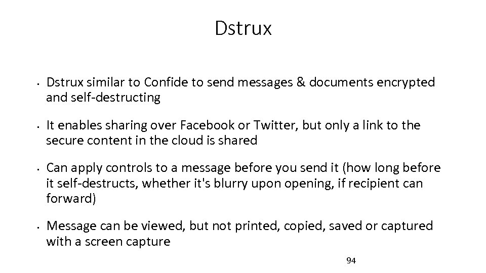 Dstrux • • Dstrux similar to Confide to send messages & documents encrypted and self-destructing It enables sharing over Facebook or Twitter, but only a link to the secure content in the cloud is shared Can apply controls to a message before you send it (how long before it self-destructs, whether it's blurry upon opening, if recipient can forward) Message can be viewed, but not printed, copied, saved or captured with a screen capture 94