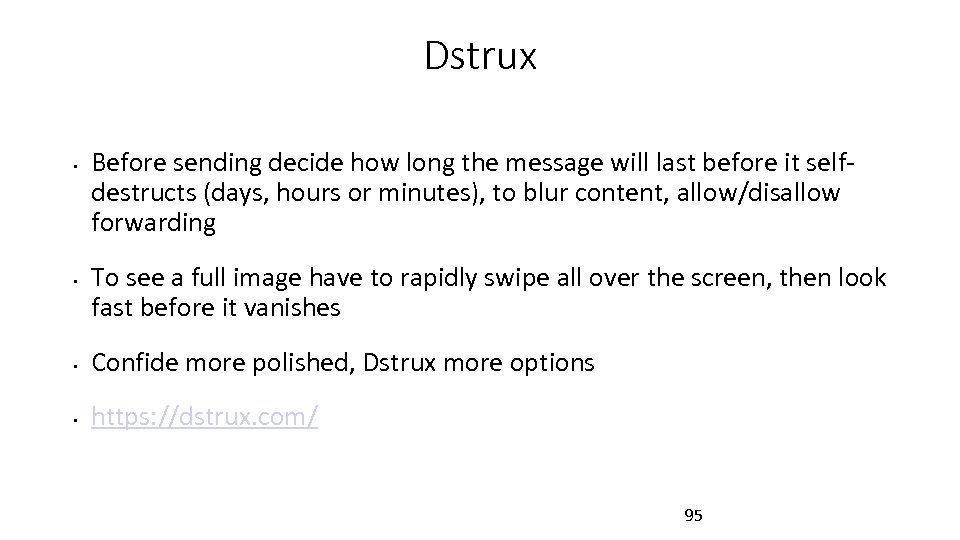Dstrux • • Before sending decide how long the message will last before it selfdestructs (days, hours or minutes), to blur content, allow/disallow forwarding To see a full image have to rapidly swipe all over the screen, then look fast before it vanishes • Confide more polished, Dstrux more options • https: //dstrux. com/ 95