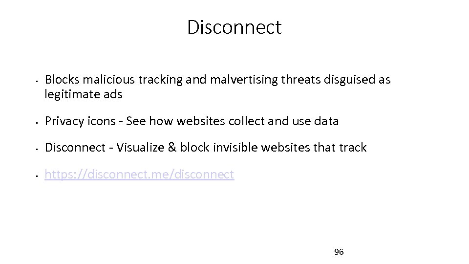 Disconnect • Blocks malicious tracking and malvertising threats disguised as legitimate ads • Privacy icons - See how websites collect and use data • Disconnect - Visualize & block invisible websites that track • https: //disconnect. me/disconnect 96