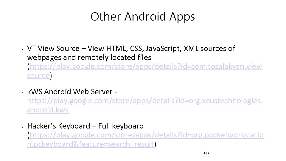 Other Android Apps • • • VT View Source – View HTML, CSS, Java. Script, XML sources of webpages and remotely located files (https: //play. google. com/store/apps/details? id=com. tozalakyan. view source) k. WS Android Web Server - https: //play. google. com/store/apps/details? id=org. xeustechnologies. android. kws Hacker’s Keyboard – Full keyboard (https: //play. google. com/store/apps/details? id=org. pocketworkstatio n. pckeyboard&feature=search_result) 97