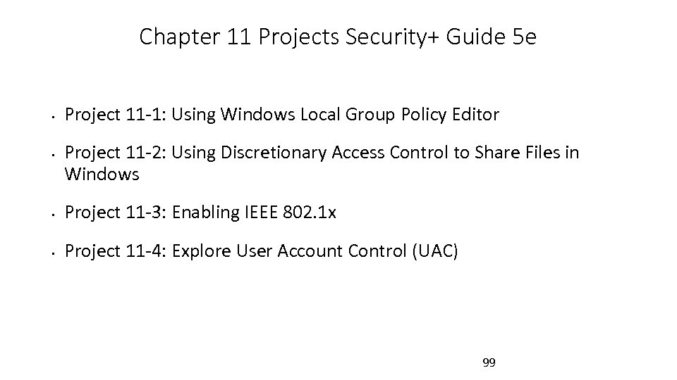 Chapter 11 Projects Security+ Guide 5 e • • Project 11 -1: Using Windows Local Group Policy Editor Project 11 -2: Using Discretionary Access Control to Share Files in Windows • Project 11 -3: Enabling IEEE 802. 1 x • Project 11 -4: Explore User Account Control (UAC) 99