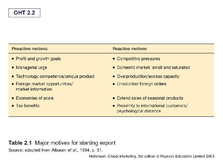 Westheat (2002) – motives for export: Contacted by foreign firm One-off order (no continued exports) Availability of foreign market info Companies growth objective Motivated by key founder/owner etc