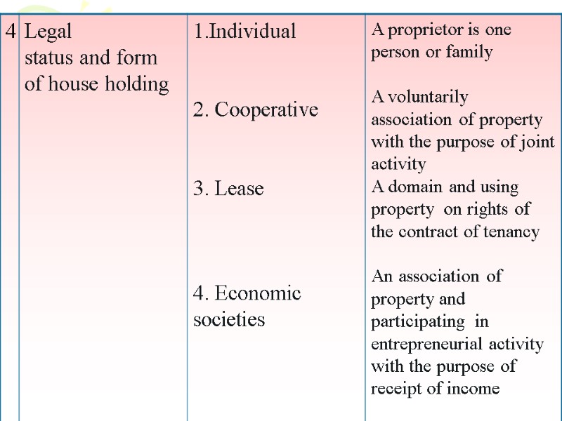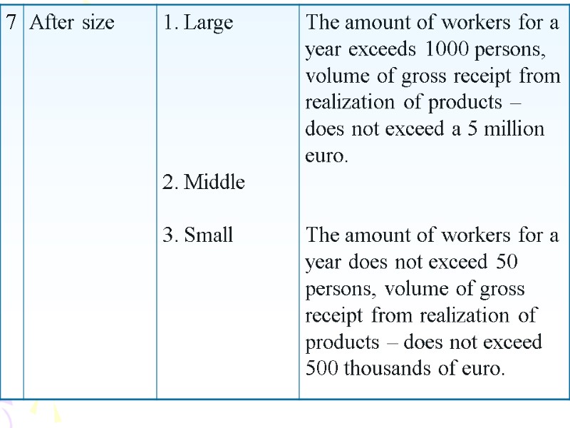 4) legal form of organization structure 5) creation of positive socially psychological climate in a collective; 6) the specification of productions and industries; 7) quality and competitiveness of products, with the management of costs and price policy; 8) the depreciation and investment policy.
