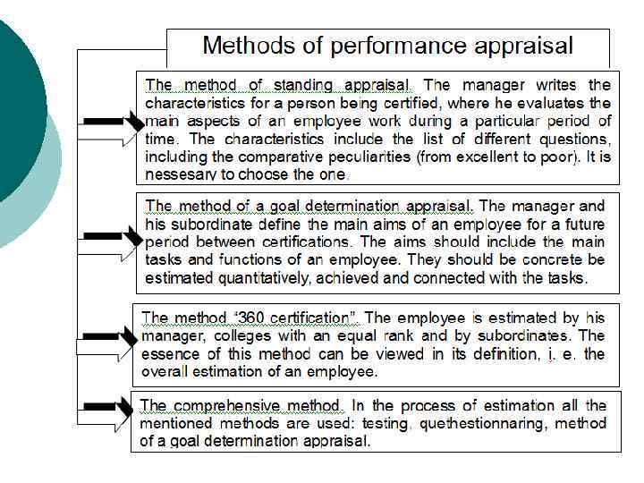 Name of the method A brief description of the method Graphic scale of evaluation Displays the data (quantitative and qualitative), each of which corresponds to the level of performance of duties (from unsatisfactory to excellent). Each rating is expressed in specific numerical values set in the scale of assessments, which are then summerized The method of management by objectives (MBO) Formulation of specific measurable goals for each employee and periodicall discussion on the way of matching towards achieving these goals Combined Methods In practice, many organizations have combined several methods of evaluation where there are graphic rating scale with descriptive phrases Scheduled control Evaluation of professional knowledge and skills, level of intelligence, experience and efficiency help of control questions