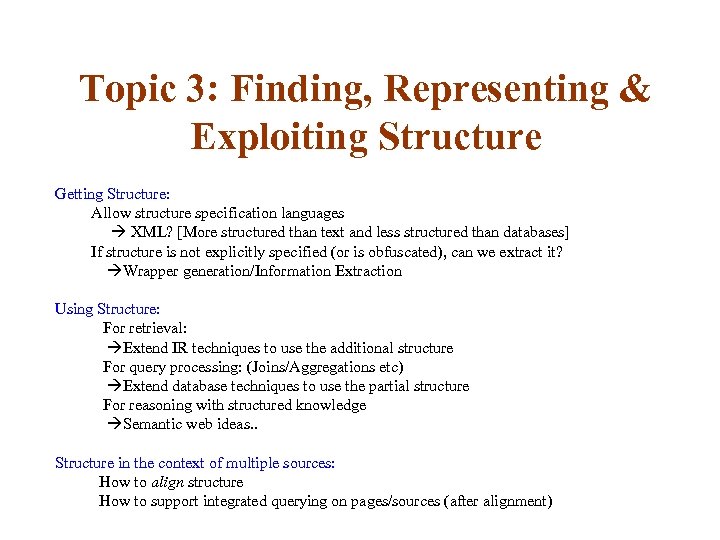 Topic 3: Finding, Representing & Exploiting Structure Getting Structure: Allow structure specification languages XML? [More structured than text and less structured than databases] If structure is not explicitly specified (or is obfuscated), can we extract it? Wrapper generation/Information Extraction Using Structure: For retrieval: Extend IR techniques to use the additional structure For query processing: (Joins/Aggregations etc) Extend database techniques to use the partial structure For reasoning with structured knowledge Semantic web ideas. . Structure in the context of multiple sources: How to align structure How to support integrated querying on pages/sources (after alignment)
