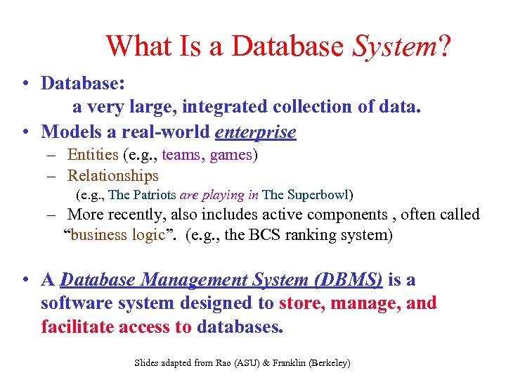 What Is a Database System? • Database: a very large, integrated collection of data. • Models a real-world enterprise – Entities (e. g. , teams, games) – Relationships (e. g. , The Patriots are playing in The Superbowl) – More recently, also includes active components , often called “business logic”. (e. g. , the BCS ranking system) • A Database Management System (DBMS) is a software system designed to store, manage, and facilitate access to databases. Slides adapted from Rao (ASU) & Franklin (Berkeley)