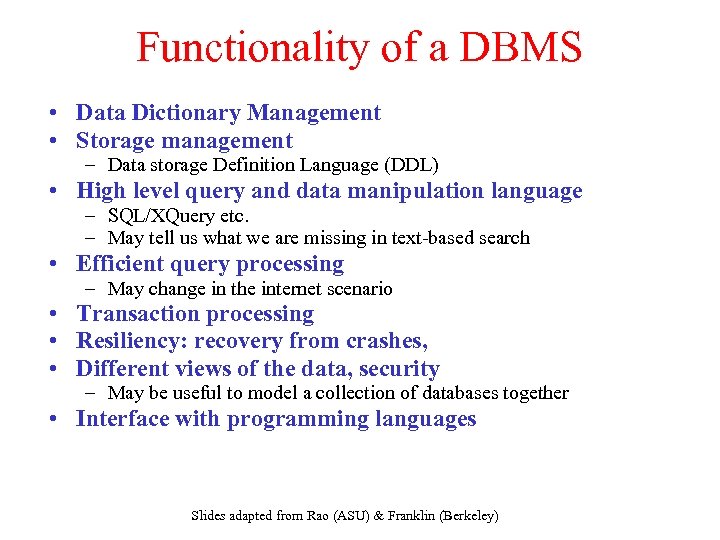Functionality of a DBMS • Data Dictionary Management • Storage management – Data storage Definition Language (DDL) • High level query and data manipulation language – SQL/XQuery etc. – May tell us what we are missing in text-based search • Efficient query processing – May change in the internet scenario • Transaction processing • Resiliency: recovery from crashes, • Different views of the data, security – May be useful to model a collection of databases together • Interface with programming languages Slides adapted from Rao (ASU) & Franklin (Berkeley)